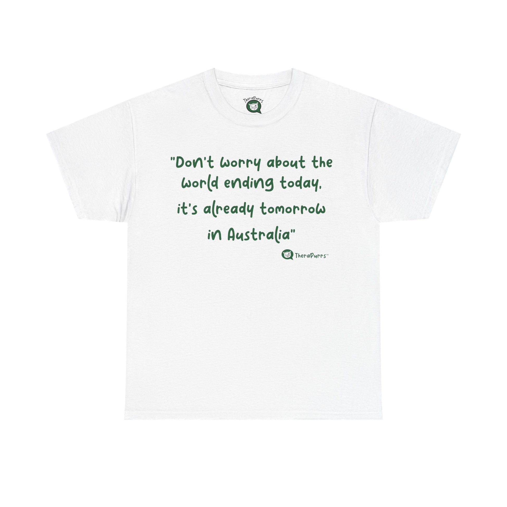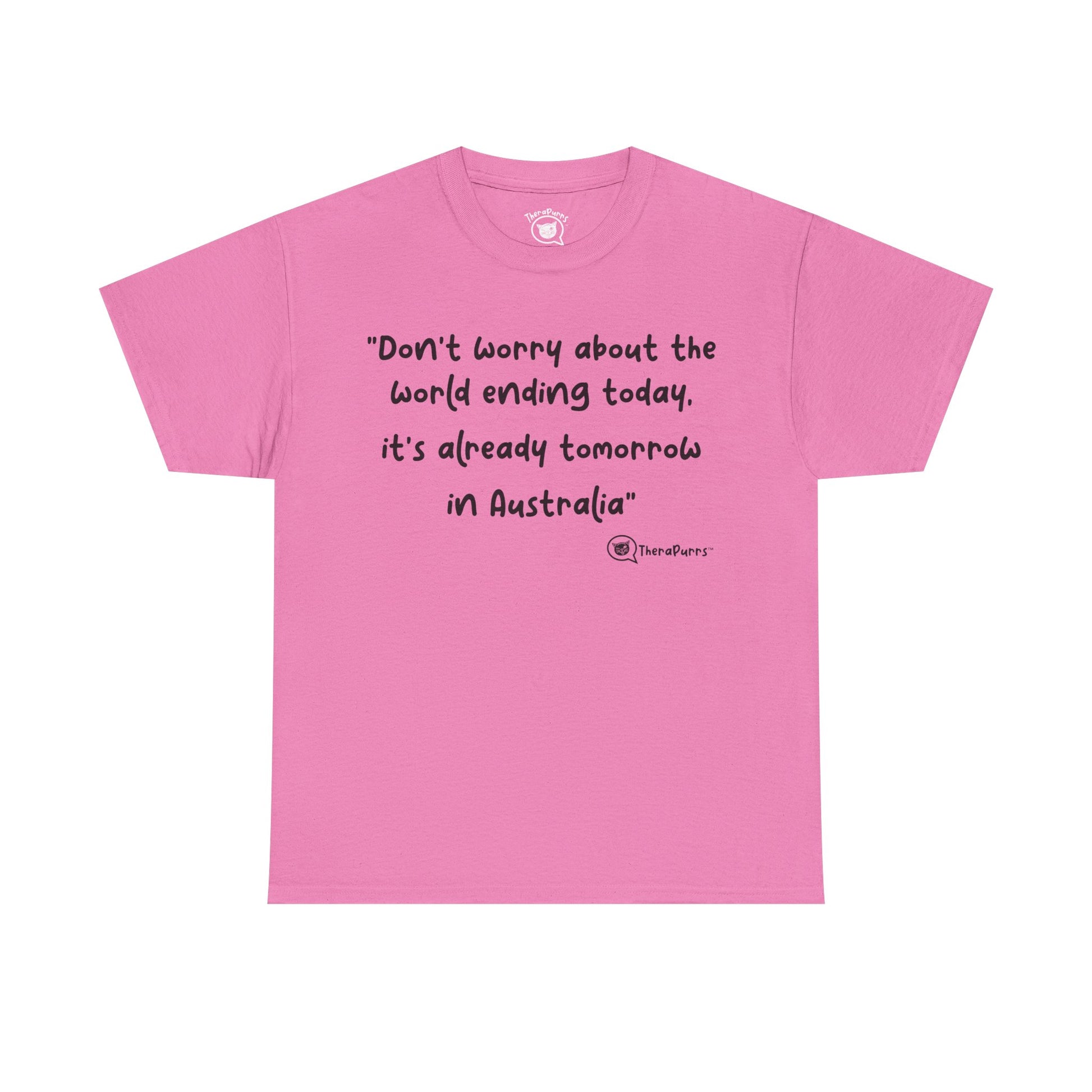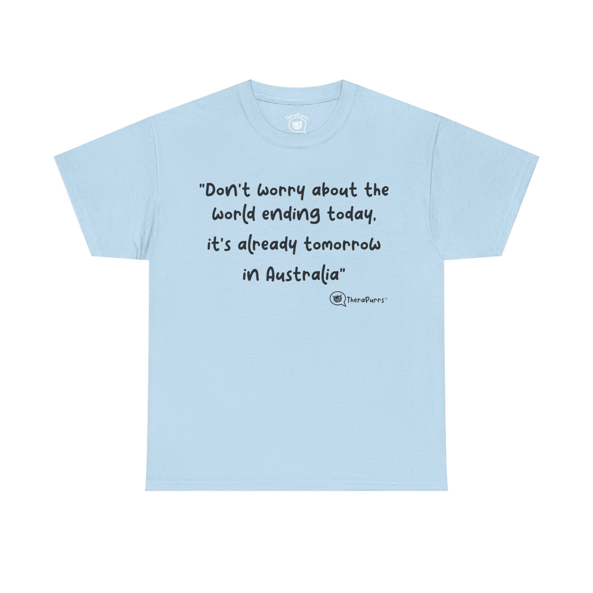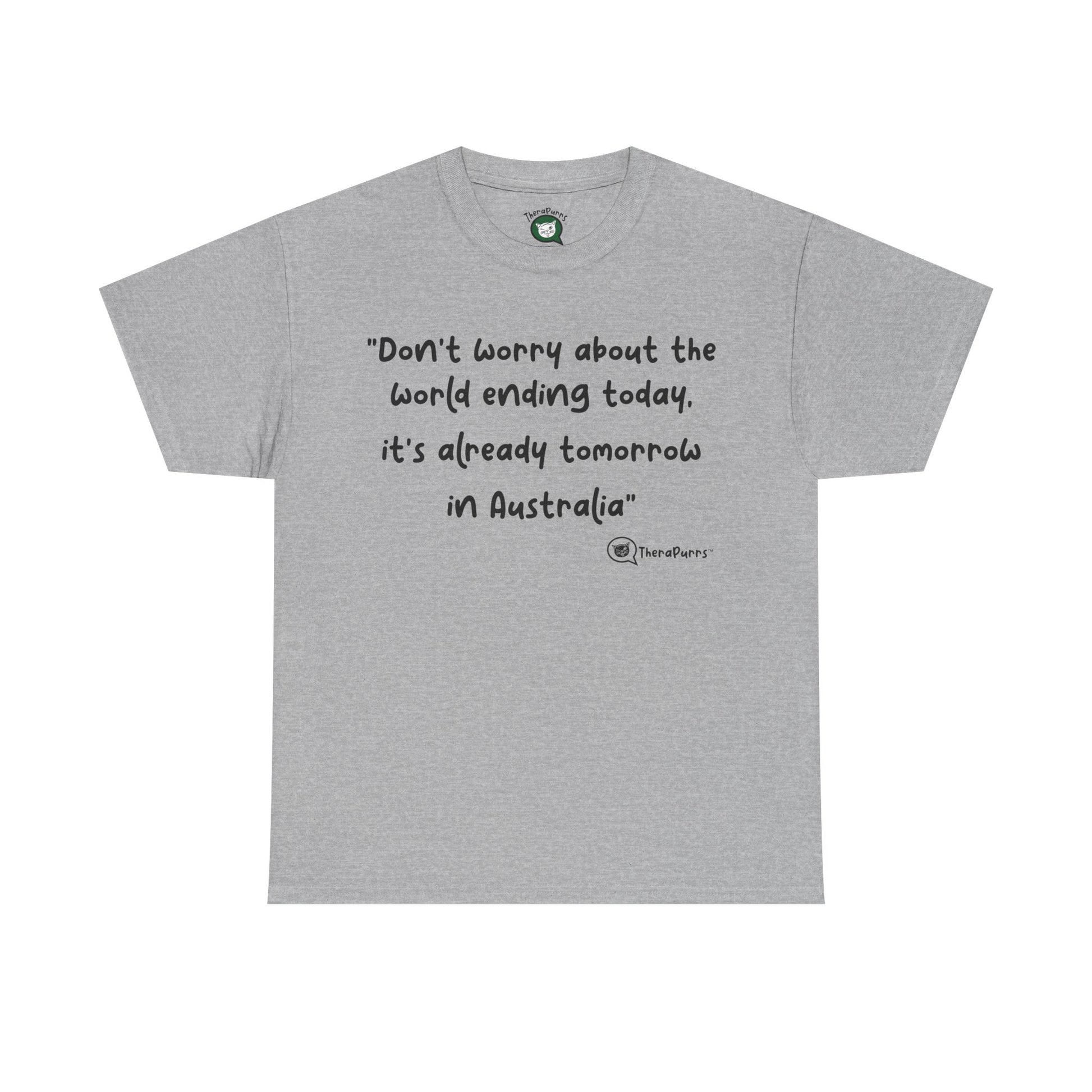TheraPurrs Phrase T-Shirt - "Don't worry about the world ending today, it's already tomorrow in Australia"