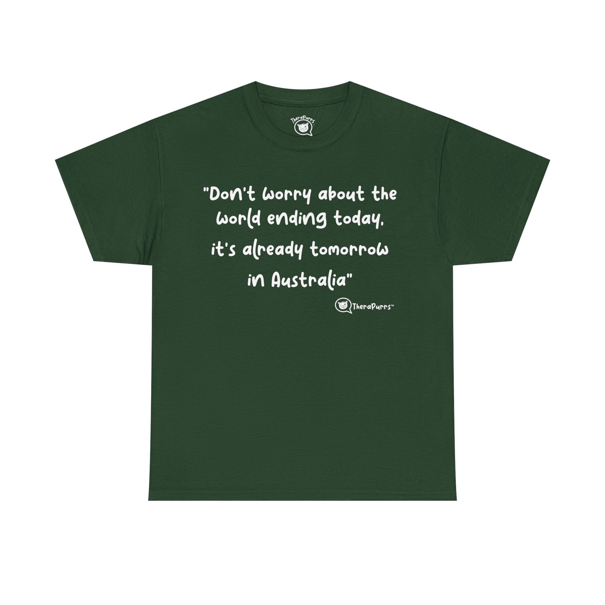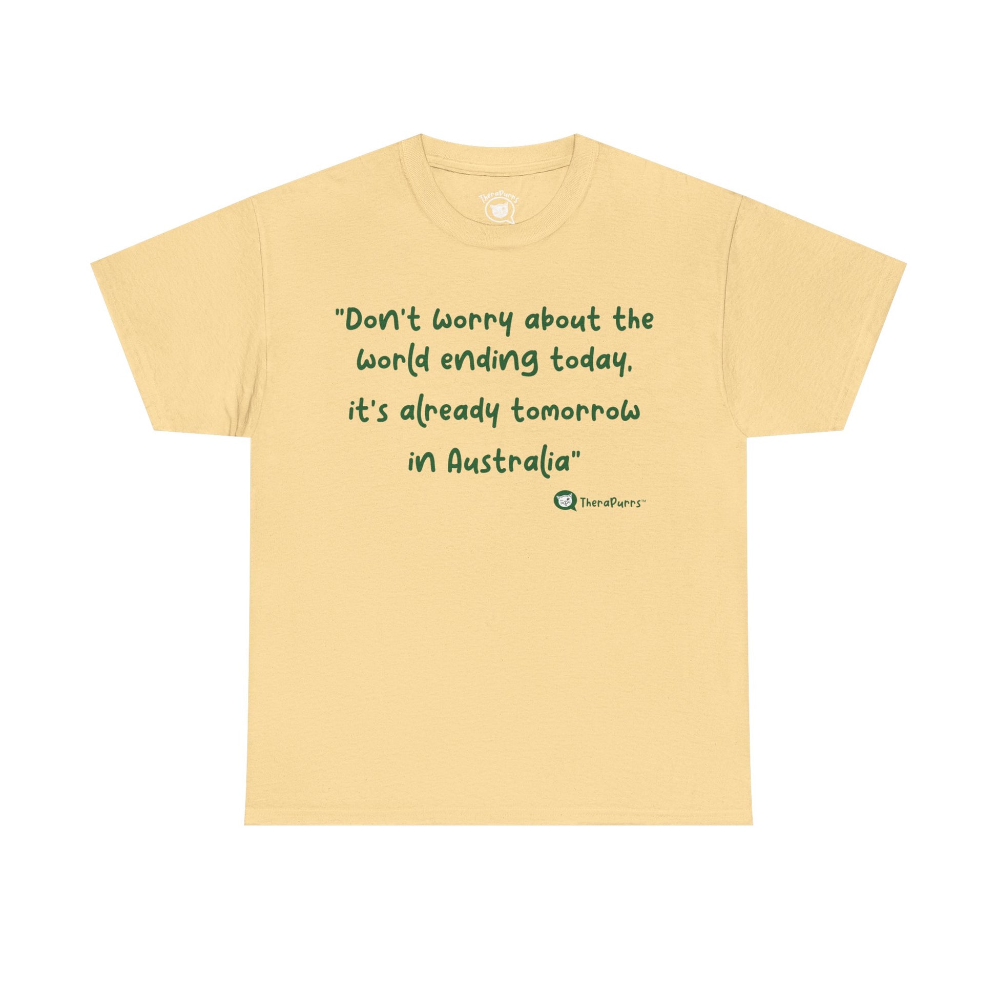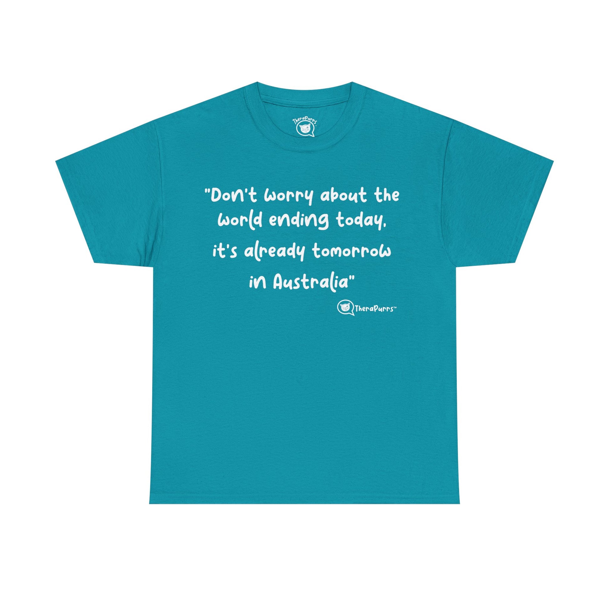 TheraPurrs Phrase T-Shirt - "Don't worry about the world ending today, it's already tomorrow in Australia"